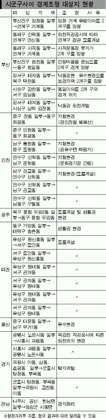현재 부산에서 경계조정이 필요하다는 민원이 제기되고 있는 지역은 9개구 8곳이다.아파트 단지가 2곳,공공시설 및 지역개발 지역이 3곳,하천 유수변경 지역이 3곳이다.행자부가 일제정비 대상으로 올려놓은 7곳보다는 1곳이 많다.