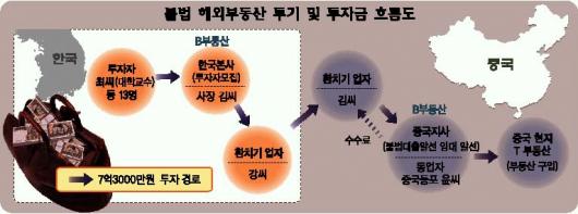 서울경찰청 외사과는 17일 인터넷 광고 등을 통해 중국 상하이(上海)의 푸둥(浦東)지구 부동산에 투자할 사람을 모집,7억 3000만원을 불법 송금하고 수수료 7600만원을 챙긴 B부동산 사장 김모(36)씨와 직원,환치기업자 등 6명을 외국환거래법 위반 혐의로 불구속 입건했다.경찰은 이들에게 외환 송금을 의뢰한 H대 교수 최모(58·모 공사 전직 간부)씨 등 투자자 13명을 같은 혐의로 불구속 입건하고,달아난 중국동포 동업자 윤모씨를 쫓고 있다.