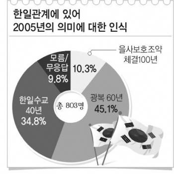 그러나 ‘충분한 사죄’를 일본에 요구하면서도 구체적인 역사에는 크게 관심을 갖지 않는 것은 안타까운 일이었다.‘한·일 관계에 있어 2005년의 의미에 대한 인식’을 묻는 항목에서는 ‘광복 60년’을 든 사람이 45.1%로 가장 많았다.하지만 일본과 국교를 재개한 ‘한·일수교 40년’을 든 사람이 34.8%나 됐던 반면 사실상 일본에 나라를 빼앗긴 ‘을사보호조약 체결 100주년’을 든 사람은 10.3%에 그쳐 아쉬움을 주었다.