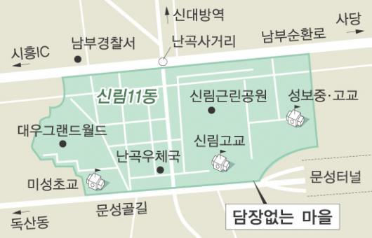 신림11동 가운데 2·5·8통에 해당하는 1571번지와 1575번지 일대는 법정 주차장을 확보한 다가구주택이나 상가빌딩을 제외한 단독주택 142가구 모두가 담장을 없앴다.대신 주차공간을 확보하고 주목,장미,과실수 등 정원수를 심고 빨간색 우체통을 앙증맞게 세워놓아 유럽의 어느 전원마을이나 우리나라 시골을 연상시킨다.