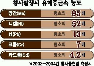 또 그동안 정부가 황사 기간에도 검출량이 크게 증가하지 않는다고 발표했던 납(Pb),크롬(Cr),카드뮴(Cd)도 각각 13배,7배,4.2배나 증가한 것으로 나타났다.