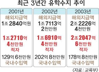 이같은 적자규모는 2001년 10억 5920만달러(1조 2710억 4000만원),2002년 14억 920만달러(1조 6910억 4000만원)에 비해 2년 만에 73.5% 늘어난 것이다.교육부는 “외국인의 국내 유학은 답보상태인 반면 초·중·고교생의 조기유학을 비롯해 국내 학생의 해외 유학이 크게 증가했기 때문”이라고 밝혔다.