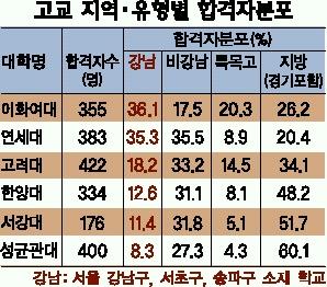 서울 강남지역 합격자 비율은 이화여대 36.1%,연세대 35.3%,고려대 18.2%로 함께 실태조사를 받은 다른 3개대의 8.3∼12.6%보다 훨씬 높았다.
