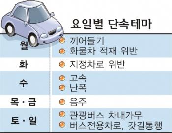 또 주5일근무제로 음주빈도가 높아진 목요일과 금요일에는 음주운전, 행락객과 교통량이 많이 몰리는 토요일과 일요일에는 관광버스 내 가무행위와 버스전용차로·갓길통행위반이 집중단속 대상이다.