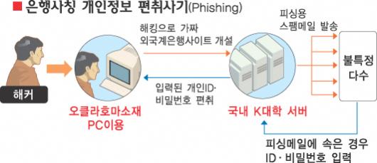 검찰에 따르면 피싱 범인은 지난 10일 미국 오클라호마에 있는 한 PC를 이용, 국내 K대학 소재 서버를 해킹해 관리자 권한을 획득한 뒤 외국계 A은행의 홈페이지를 복사한 개인정보사냥용 화면(피싱화면)을 설치했다.