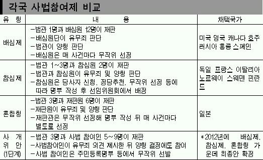 사법개혁위원회가 2일 확정한 1단계 국민 사법참여안은 배심제와 참심제의 혼합형이다. 배심제·참심제 모두 문제점이 있는 만큼 혼합형을 시범실시해 우리 사법풍토에 맞는 모델을 찾겠다는 것이다.1단계안은 위헌논란을 피하기 위해 사법참여인단의 유·무죄 및 양형 판단에 강제력을 두지 않았다.