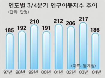 경기침체로 취업이 어려워진 데다 부동산거래마저 뜸해 이사하는 사람이 크게 줄었다. 종합부동산세 도입 논란과 헌법재판소의 신행정수도 이전 위헌 결정 등 정책 불확실성마저 겹쳐 2004년 전체 인구이동은 경제개발이 본격화되기 전인 1970년대 초반 정도 수준으로 떨어질 전망이다.