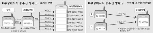 경찰이 공개한 문자메시지 송수신 목록에 따르면 한 번호 사용자가 여러 휴대전화 번호와 시험 답안으로 추정되는 숫자를 주고 받은 사례도 있었다. 특히 한 사람으로부터 받은 문자메시지를 6명에게 전달하는 중계조 번호가 최소한 2개가 적발됐다.