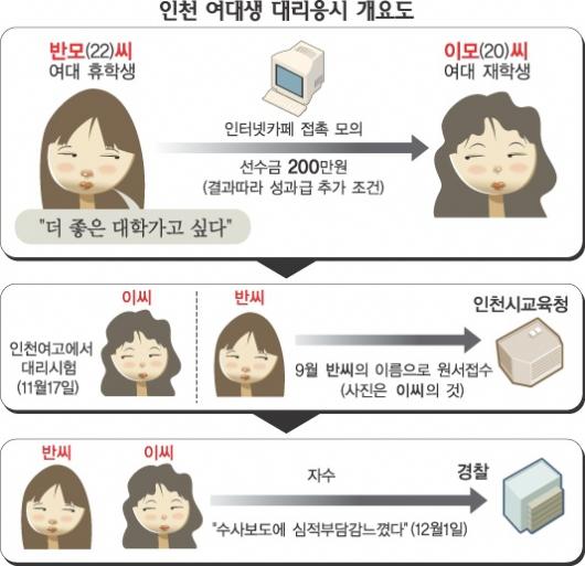 서울에서는 이날 오후 경찰에 전화를 걸어 대리응시 사실을 자백한 C의대생 기모(21·서초동)씨가 서초동 K병원 앞에서 붙잡혔다. 인천에서는 대리시험을 의뢰하고, 실제로 치른 대학 휴학생 반모(22)씨와 대학생 이모(20)씨 등 두 명의 여성이 경찰에 함께 자수했다.