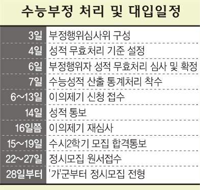 한편 교육인적자원부는 이날 ‘수능시험 부정행위 심사위원회’를 구성하고 4일 첫회의를 열어 부정행위자에 대한 성적 무효처리 기준을 결정하기로 했다. 교육부는 이날 경찰 수사가 마무리된 부정행위자 1차 명단과 관련 기록을 넘겨받아 6일까지 무효처리 대상자를 확정할 계획이다.