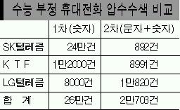 이 가운데 웹투폰 부정 사례 등이 포함돼 있었으나 경찰 수사에서 제대로 걸러내지 못하는 등 허점을 드러냈기 때문이다. 앞서 1차 수사 때는 26만건의 메시지 가운데 우선 6200여건을 선별한 뒤 추가 작업을 통해 최종적으로 의심이 가는 메시지 587건을 추려냈다. 특히 경찰은 인터넷 문자메시지 서비스로 답안을 전송한 ‘웹투폰’방식의 부정행위가 있었는지를 면밀히 살피고 있다. 하지만 송신자와 수신자의 번호만으로는 ‘웹투폰’인지 휴대전화에서 휴대전화로 전송하는 ‘폰투폰’인지 가려내기 어려워 수사가 단기간에 마무리되지는 않을 것으로 보인다.