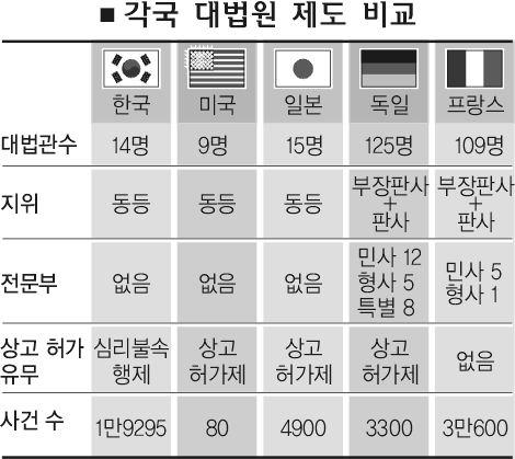 사개위는 오는 13일 제26차 전체회의에서 ‘대법원의 기능과 구성’에 대해 결론짓고 27일 최종 건의문을 채택할 방침이다. 대법원은 1948년 대법관 5명을 임용한 뒤 61년 9명,69년 15명으로 늘렸다가 81년 상고허가제를 실시하며 12명으로 줄였다. 소송가액 또는 중요성 등을 기준으로 일정 사건의 상고를 금지하는 상고허가제는 지난 90년 폐지됐고, 법령 위반 등 상고이유가 없을 때 심리하지 않는 심리불속행제는 94년부터 시행되고 있다.