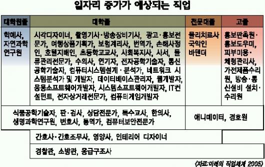 대학원 졸업 이상 학력을 요구하는 분야에서는 학예사와 자연과학연구원이 선정됐다. 대졸에서는 시각 디자이너와 여행상품 기획가, 초등학교 교사, 수의사, 연기자, 전자상거래 전문가 등 25개 직업의 일자리가 크게 늘 것으로 전망했다. 전문대졸은 물리치료사와 바텐더 등 3개, 고졸은 피부미용 및 체형관리사와 홍보 도우미 등 4개가 꼽혔다.