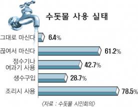 수돗물의 안전성에 대한 우려가 커 수돗물을 바로 마시는 시민은 100명 중 6명에 불과하고, 생수를 사서 마시는 경우도 100명 중 29명에 달했다.