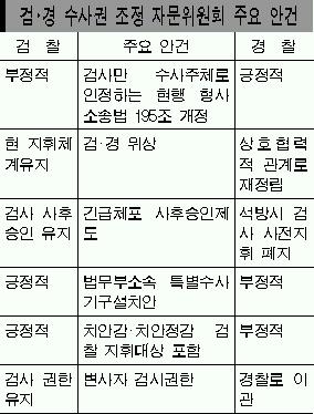 반면 긴급체포때 요구되는 검사의 ‘사후승인제도’에 대해서는 양측이 합의안을 마련, 자문위원회에 제시한 것으로 알려졌다. 합의안은 검사의 사후승인제도는 긴급체포의 남용을 막기 위해 유지하되 석방때 필요한 검사의 사전지휘제도는 폐지하는 쪽으로 가닥을 잡았다.