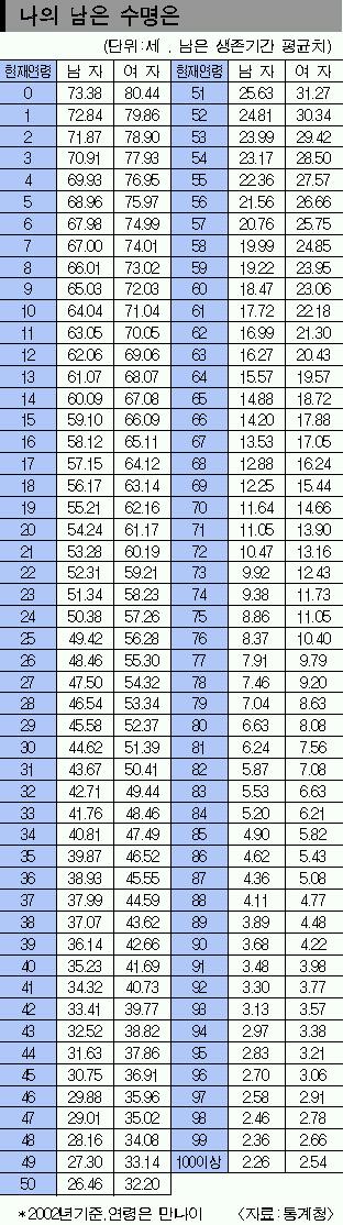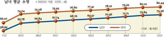 통계청이 20일 발표한 ‘2002년 생명표’에 따르면 남성의 평균수명은 73.38세였다.1년 전 72.84세보다 0.54년(6개월17일)이 늘었다.11년 전인 1991년의 67.74세보다는 5.64년이 연장됐다. 여성의 평균수명은 80.44세로 전년의 80.01세보다 0.43년(5개월7일)이,11년 전 75.92세보다는 4.52년이 각각 늘었다. 남녀를 합하면 77.00세로 1년 전보다 0.47년이 연장됐다. 선진국 모임인 경제협력개발기구(OECD) 30개 회원국의 평균수명(남자 74.7세, 여자 80.6세)과 비교할 때 남자는 조금 못 미치고 여자는 비슷한 수준이다.