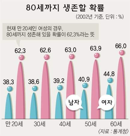 우리나라 남자들의 인생 반환점은 평균 만 37세다. 이 때가 되면 살아갈 날들이 살아온 날들보다 점차 줄어들기 시작한다. 여자들은 남자들보다 네살 많은 41세다.2002년 기준으로 평균수명이 남성은 73.4세, 여성은 80.4세이기 때문이다. 남자의 경우, 통계가 처음 만들어진 1971년만 해도 평균수명이 58.99세에 불과했지만 75년(60.19세) 환갑을,97년(70.56세) 칠순을 넘긴 뒤 빠르게 늘어나고 있다. 세계에서 유례없는 ‘초고속 고령화’의 단면이다.