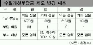 개선방안에 따르면 현재 t당 38원 수준인 부담금을 690원으로 18배가량 올리고 부과대상도 지하수를 취수하는 모든 기타샘물 제조업체로 확대하기로 했다. 지금까지는 하루 300t 미만 취수업체(40여개)의 경우 부담금을 한푼도 내지 않았다. 생수업체의 부담금은 현행(7.5%)보다 조금 낮은 ‘평균판매가격의 6.75%’를 적용하기로 했다. 생수업계의 경영난 등을 감안해 2000년 부과율을 20%에서 7.5%로 대폭 내린 데 이어 5년 만에 다시 소폭 조정했다.
