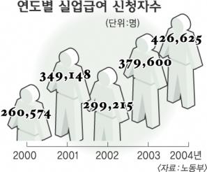 23일 노동부에 따르면 올해 들어 지난달 말까지 실업급여 신청자 수는 모두 42만 6625명으로 지난해 37만 9600명보다 5만명 가까이 늘어났다. 이는 IMF 관리체제에 있던 지난 1998년 43만 8465명 이후 최대 규모다. 실업급여 신청 사유의 경우 권고사직이 27만 5160명으로 전체의 64.5%에 달했다.▲계약기간 만료 5만 943명 ▲도산과 폐업 3만 5045명 ▲정리해고 2만 6430명 ▲정년퇴직 1만 1169명 ▲질병 등 기타 2만 7878명 등의 순이었다.
