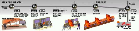 3일 서울 지하철에서 50대 남자가 불을 질러 2년 전 대구 참사의 악몽이 재현될 뻔한 아찔한 사고가 발생했다. 다행히 승객 150여명이 긴급 대피해 인명 피해는 없었으나 전동차 3량은 완전히 못쓰게 됐다.