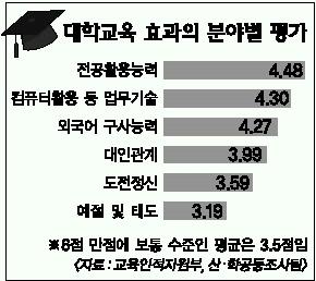 기본능력과 세계관 조직관, 가치관, 인성관, 적용력 등 6개 분야에 대해 대학교육의 효과에 대한 기업의 인식을 묻는 조사에서 의사표현력과 추진력, 시사·업무상식 등 기본 능력은 6점 척도에서 4.14점으로 ‘다소 만족’하는 수준 이상인 것으로 나타났다. 반면 인성관과 가치관은 각 평균 3.79점,3.67점으로 상대적으로 낮았다.