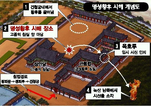 ‘한국 왕비 살해 일건(一件) 제2권’이라는 제목의 이 보고서에 따르면 일본인 자객들은 일본 수비대의 협조를 얻어 광화문을 통과한 뒤 경복궁-경회루를 거쳐 명성황후의 침실인 곤령합이 있는 건청궁(乾淸宮)으로 침투했다. 이 궁 어딘가에서 명성황후를 찾아내 건청궁 구역 안의 장안당과 곤령합 사이 뜰에서 시해했으며, 시신은 곤령합 동쪽 건물인 옥호루 방에 안치됐다가 건청궁 동쪽에 있는 녹산 남쪽에서 화장됐다고 적시하고 있다. 그동안은 옥호루 실내가 시해장소라고 알려져왔다.