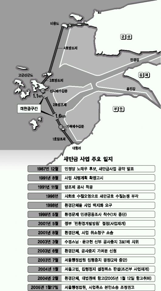 자칫 죽음의 호수라고 불린 시화호나 지난 1991년 방조제 공사를 착공해 2002년에 완공했지만 수질악화로 해수를 유통한 화옹호의 재판이 될 가능성이 높다고 덧붙였다. 방조제 공사를 중단하고 담수호를 만들지 않아도 수질오염에 대한 부담에서 벗어나면서 예정된 간척지의 절반인 4280만평을 확보해서 정부와 전라북도가 필요한 용지를 확보할 수 있다고 설명했다.