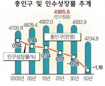 통계청이 19일 발표한 ‘장래인구 특별추계’에 따르면 올해 4829만 4000명인 우리나라 인구는 2020년 4995만 6000명으로 정점을 찍은 뒤 점차 감소,2050년에는 4234만 8000명으로 떨어질 것으로 예측됐다.