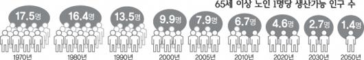 2000년에는 생산가능인구 100명이 노인 10.1명을 부양하면 됐지만 2020년에는 21.8명,2050년에는 69.4명으로 늘어날 전망이다. 현재 전체의 9.1%인 65세 이상 인구가 2020년에는 15.7%로,2050년에는 37.3%로 증가하기 때문이다.