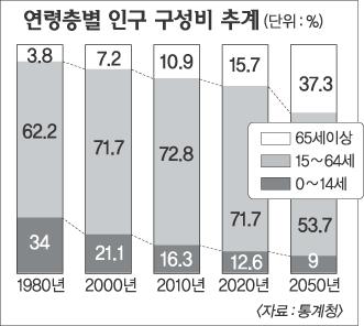 속도가 너무 빨라서, 지금 당장이야 유엔이 집계한 선진국 평균(38.7세)보다 낮지만 2020년에는 43.7세로 선진국(42.3세)을 추월하고,2050년에는 56.2세로 선진국(45.2세)과도 까마득하게 벌어질 것으로 전망됐다.