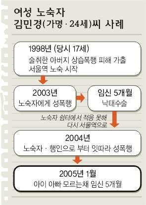 22일 오전 1시쯤 서울 중구 봉래동 서울역 대합실. 짧은 스포츠 머리에 야구모자를 눌러써 언뜻 남자같이 보이는 김민경(가명·24)씨가 남성 노숙인 10여명에게 둘러싸여 악다구니를 지르고 있었다. 김씨는 현재 임신 5개월째. 남성 노숙인들이 김씨에게 입에 담기 어려울 정도의 욕설을 퍼부으며 손가락질을 해댔다.