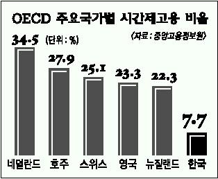 24일 중앙고용정보원이 밝힌 ‘OECD 주요국의 고용구조’에 따르면 2003년 기준 한국의 총고용 중 시간제 고용의 비율은 7.7%로 OECD 28개국 중 23위에 머물렀다.