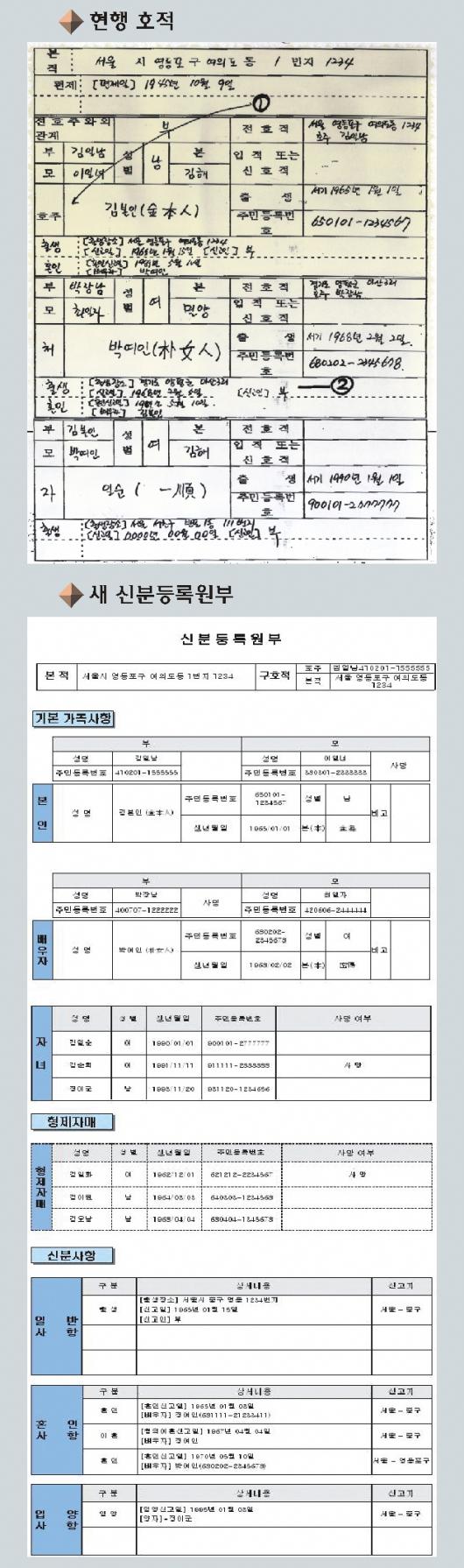 새 신분등록부가 확정됨에 따라 호주를 중심으로 기록됐던 ‘가족’ 개념이 완전히 달라진다. 새 신분등록제도인 ‘1인1적(一人一籍) 가족부제’는 개인을 중심으로 가족관계를 정리한 것이다. 국민 모두가 각자의 신분등록부를 갖게 된다. 여기에는 출생, 사망, 혼인, 이혼, 입양 등 출생 이후 모든 신분변동이 기록된다.