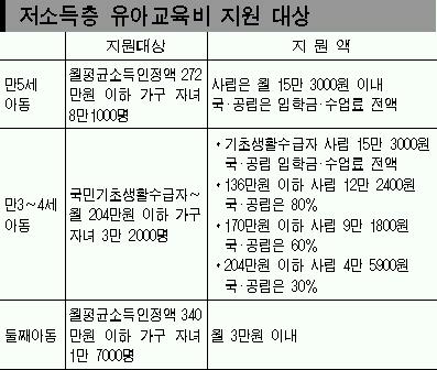만3,4세 아동의 경우 법정 및 4인 가족 소득인정액 204만원 이하 저소득층에 대해 소득수준에 따라 입학금·수업료의 30∼100%를 지원한다.