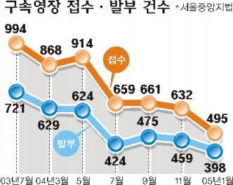 서울중앙지검과 법원이 구속에 더욱 신중해진 것은 지난해 하반기부터다. 지난해 6월과 7월 서울중앙지법의 구속영장 발부율이 68%와 68.8%로 떨어졌다.90%를 웃돌던 영장발부율은 2003년 76.8%로 떨어졌고, 지난해 70%선도 무너졌다.