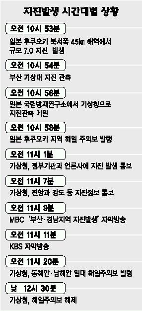 20일 오전 10시55분쯤 일본 후쿠오카에서 발생한 강진(强震)이 부산 경남 등 전국 대부분 지역에서 감지돼 시민들이 휴일 오전 한때 불안에 떨었다.