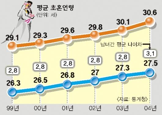 지난해 평균 초혼연령은 남자는 30.6세, 여자는 27.5세로 전년보다 각각 0.5세,0.2세 많아졌다.10년전(남자 28.3세, 여자 25.2세)과 비교하면 남녀 모두 2.3세나 결혼이 늦어진 것이다. 그동안 남녀간 평균 초혼연령의 격차는 96∼97년 2.9세,98∼2003년 2.8세 이후 계속 좁혀지는 양상을 보여 왔으나 지난해에는 3.1세로 8년 만에 늘어났다.