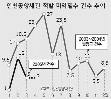 지난해 말까지 굵직한 마약사범을 잇따라 적발했던 세관측은 “정보기관 등의 고급 정보가 사라졌기 때문”이라고 이유를 꼽는다. 보통 승객 중 샘플을 추려 검색을 하기 때문에 사전 정보가 없는 상태에서는 단속에 애를 먹을 수밖에 없다는 것이다.