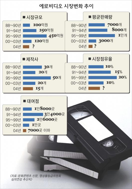에로비디오의 주요 소비처인 비디오대여점도 한때는 4만곳에 이르렀지만 이제는 7000곳도 되지 않는 것으로 추산된다.