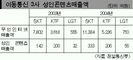 진 의원은 최근 정보통신부로부터 제출받은 ‘이동통신사 성인 콘텐츠 매출현황’을 분석해 이같은 수치를 산출했다. 지난해 SKT,KTF,LGT가 올린 성인 콘텐츠 매출액은 각각 333억,206억,56억원으로 전체 595억원에 달했다. 매출액은 전액이 정보 이용료다.