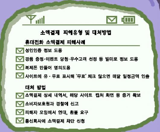 휴대전화 소액결제란 인터넷으로 콘텐츠나 물품을 살 때 휴대전화번호와 주민등록번호를 입력하면 결제대행업체가 휴대전화 문자메시지로 승인번호를 보내고, 이를 다시 업체 사이트에 입력해 휴대전화 요금으로 결제가 이루어지는 시스템이다.12만원까지 손쉽게 결제가 가능하다. 그러나 관련 규정과 시스템이 허술한 탓에 사용하지도 않은 대금이 빠져나가고 있다.