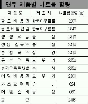 한국야쿠르트 팔도비빔면(130g) 한 봉지의 나트륨 함량은 3200㎎, 팔도비빔면 컵(117g) 2940㎎, 농심 생생우동(276g) 2810㎎, 생생 칼국수(200g) 2410㎎, 삼양 손칼국수(100g) 2410㎎으로 기준치를 훨씬 웃돌았다.