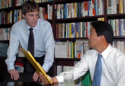 열린우리당 임종석 의원과 뉴질랜드 출신으로 인턴 정책비서로 일하고 있는 크리스 크론이 8일 국회 의원회관 사무실에서 의정활동에 대해 논의하고 있다.