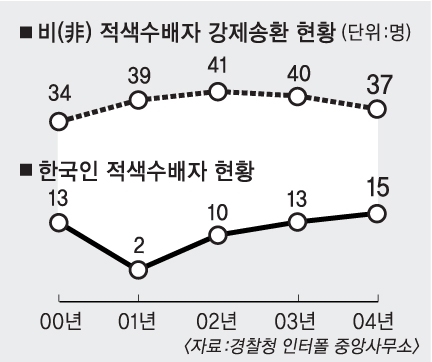 한국인 적색수배자는 2000년 13명이 처음 오른 후 2001년 2명,2002년 10명,2003년 13명, 지난해 16명으로 증가했다. 혐의별로는 사기 25명, 횡령 10명, 살인 6명, 배임 3명, 부정수표단속법 3명, 강도 2명, 마약 2명, 기타 범죄가 6명이다.