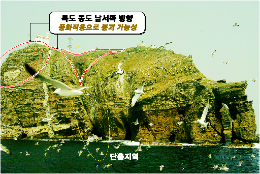 또 “동남쪽에서 동도를 정면으로 바라봤을 때 왼쪽으로 기울어진 단층 상단부의 경우 역삼각형 형태 부분의 지질이 특히 무르기 때문에 빠르게 풍화가 진행되고 있다.”고 덧붙였다.