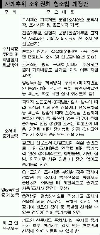 사개추위는 검찰이 피의자 신문 조서를 작성하려면 ▲수사과정에 변호사를 원칙적으로 입회토록 하고 ▲수사의 전 과정을 기록·첨부하며 ▲진술거부권을 구체적으로 알리고 본인의 자필확인을 거치는 등 적법절차를 밟도록 했다. 아울러 검찰조서가 ‘특별히 신빙할 수 있는 상태’(특신상태)에서 작성됐을 때에만 증거능력을 인정하기로 했다. 사개추위는 피의자가 검찰의 신문조서에 대해 이의를 제기하면 원래 기재된 내용을 남겨두고 자필확인을 거쳐 수정하도록 해 조사 과정이 조서에 생생히 드러나도록 했다. 이는 피고인이 법정에서 조서의 내용을 부인하면 증거능력을 인정하지 않았던 사개추위 초안에 비해 검찰측 입장이 일부 반영된 것으로 풀이된다.