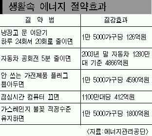남편과 세 아이가 함께 사는 문씨 가족은 매일 아침 어두운 화장실에서 볼일을 본다. 장마철이나 겨울철이 아니면 화장실 불은 절대 켜지 않는 것이 이 집안의 철칙이다. 아이들의 컴퓨터 사용 시간도 하루 두세시간을 넘기지 않는다. 남편 출근길에 TV와 비디오를 연결하는 잭을 챙겨 보내 아예 아이들이 TV를 볼 수 없도록 한다. 문씨는 대신 그 시간에 아이들과 함께 책을 읽는다. 반찬이나 자주 사용하는 양념은 크기가 똑같은 작은 통에 담아 냉장고에 보관해 놓고 먹으면 냉장고 문을 열어 놓는 시간이 줄어든다. 물은 페트병에 담아 얼려 밖에 놓고 마신다. 역시 냉장고 문을 자주 열지 않는 방법이다. 전력 소모가 많은 전기 밥솥은 사용하지 않는다. 세수한 물이나 쌀 씻은 물은 모아 두었다가 소변 뒤처리용으로 사용한다. 컴퓨터·TV·선풍기 등 모든 전자제품은 사용 후 반드시 플러그를 뽑는다. 문씨의 절약 노하우를 그대로 보고 배운 둘째딸 한하은(6)양은 아빠·엄마의 절약 상황을 늘 점검하고 지적하는 엄마보다 더 한 ‘짠순이’다. 이렇게 해서 문씨 가족이 내는 한달 전기세는 1만 2000원 정도. 보통 가정의 5분의1가량 밖에 안 된다.