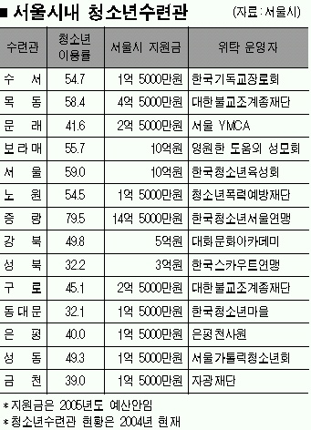 서울시가 민간 청소년단체에 위탁운영하는 청소년수련관의 운영비는 연간 10억∼20억원 정도 들지만 시 지원금은 대개 3억원 안팎이다. 이에 따라 청소년수련관은 수영장·헬스 등 부대시설을 운영하면서 나머지 비용을 충당해야 하지만 최근 민간체육시설·구민체육센터 등이 들어서면서 시설 노후화로 이마저도 인원이 줄어들고 있다.