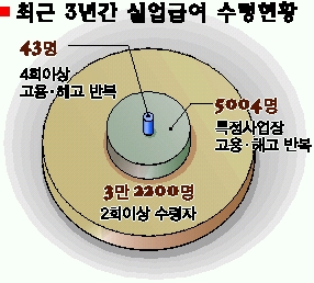 서울신문은 20일 열린우리당 제5정조위원장인 이목희 의원과 노동부로부터 입수한 ‘최근 3년간 고용보험의 수급자 중 2회 이상 실업급여를 탄 근로자’ 3만 2200명의 자료를 분석해 특정 사업장으로부터 고용과 해고를 반복하며 실업급여를 받고 있는 노동자가 5004명에 이른다는 특이점을 찾아냈다. 이는 2회 이상 실업급여를 받은 노동자의 15.54%에 해당하는 수치다.