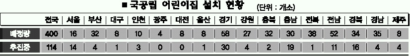 국공립 보육시설은 현재 1749곳으로 전체 보육시설의 5% 수준에 그친다. 여성가족부는 보육에 ‘공보육’이라는 개념을 도입, 국공립 보육시설을 올해부터 2008년까지 매년 400곳씩 확충해 전체의 10%로 끌어올릴 방침이었다.